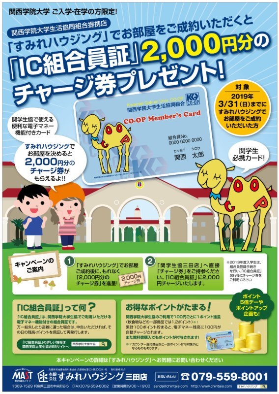 関西学院大学③関西学院大学 ご入学・在学の方限定☆★【すみれハウジング】でお部屋をご成約いただくと「IC組合員証」2000円分のチャージ券プレゼント!!